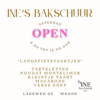 Voor actuele openingstijden kijk op je mijn google account ‘By INE Passie & Ambacht’, of hou mijn sociale mediakanalen in de gaten. Wanneer het krijtbord aan de straat staat, is INE’s BAKSCHUUR open!
