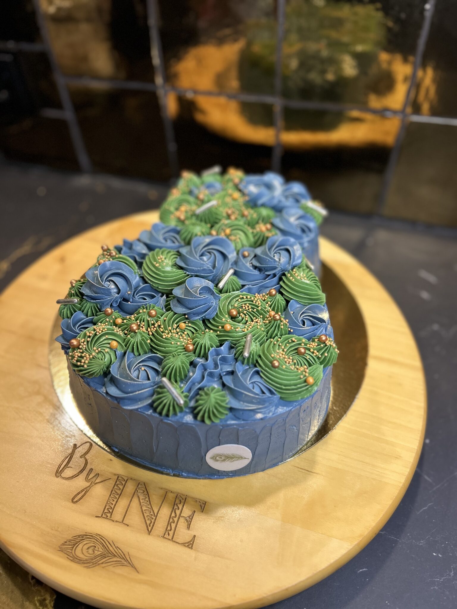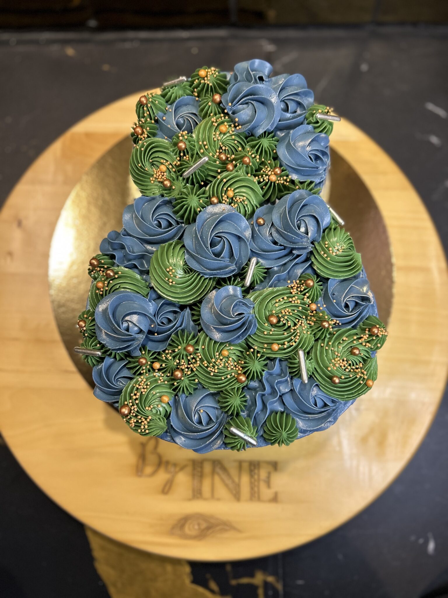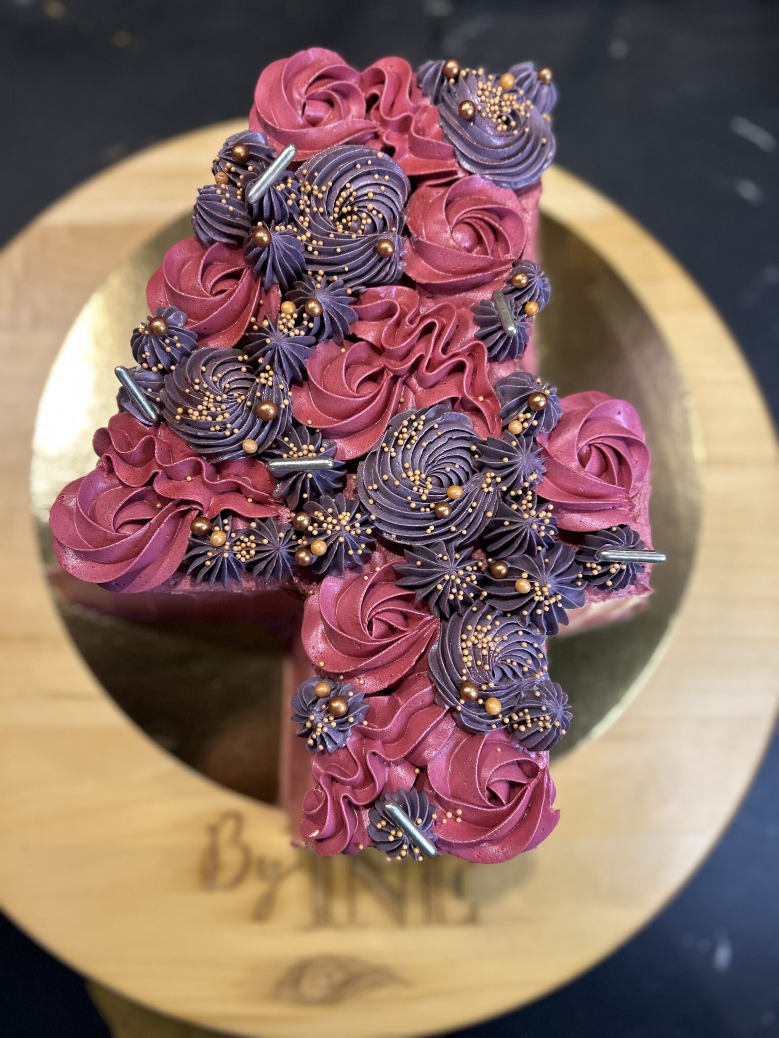 Een Cijfer Taart, rijkelijk gevuld met room en INE’s Jam. Afgewerkt met een zijdezachte boter crème.