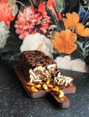 Breek de koekjes in kleine stukjes, en meng deze met de noten en cranberries door het cacao beslag. Zorg dat alle ingrediënten voorzien zijn van een laagje beslag.